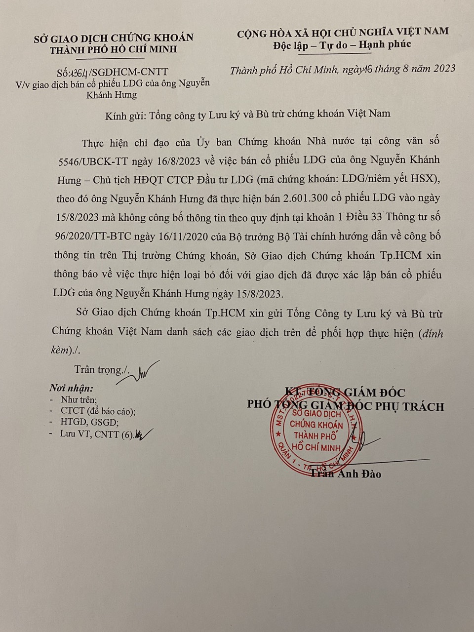 Về việc loại bỏ đối với giao dịch đã được xác lập bán cổ phiếu LDG của ông Nguyễn Khánh Hưng ngày 15/08/2023 của Sở Giao dịch Hồ Chí Minh