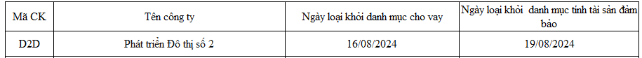 Công ty cổ phần Chứng khoán BIDV (BSC) trân trọng thông báo loại mã cổ phiếu D2D ra khỏi danh mục được phép ký quỹ tại BSC. Nội dung cụ thể như sau: