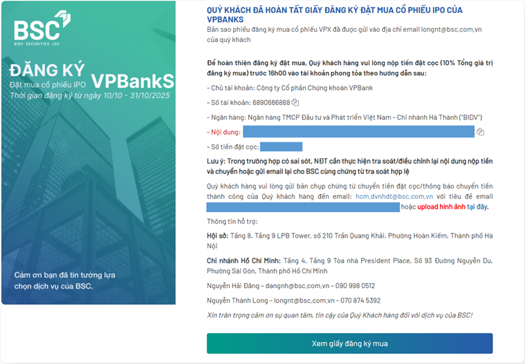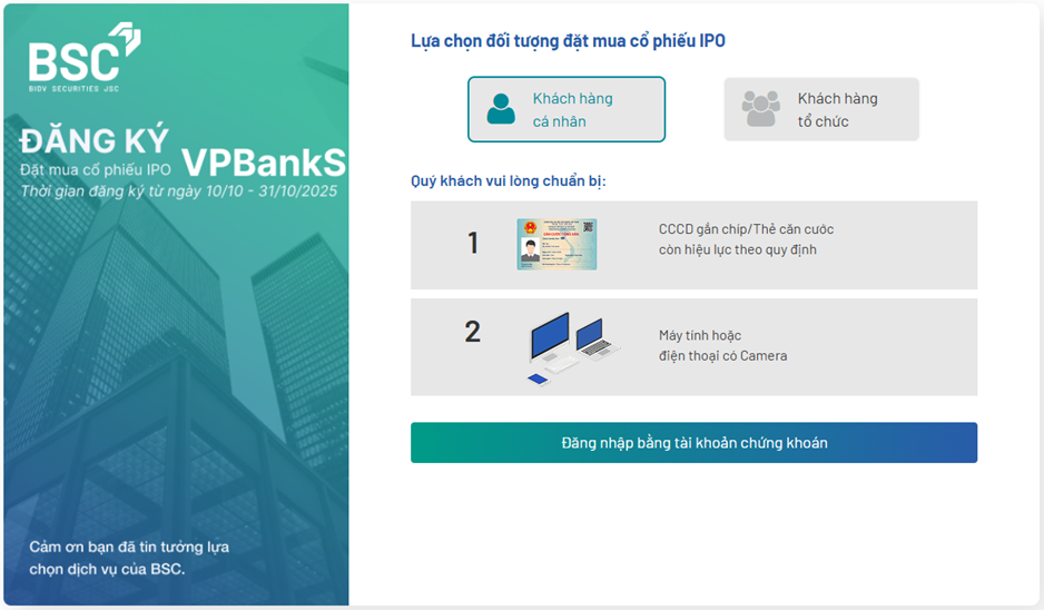 Công ty Cổ phần Chứng khoán BIDV (BSC) kính gửi Quý Nhà đầu tư Hướng dẫn đăng ký mua cổ phiếu IPO VPBankS trực tuyến.