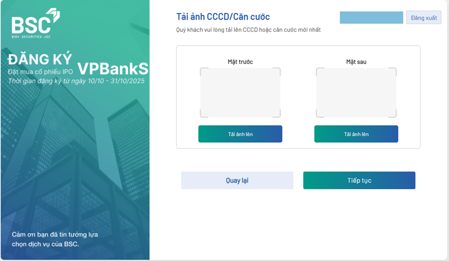 - Tải ảnh CCCD/Căn cước (CCCD/Căn cước trùng khớp với thông tin của khách hàng tại BSC)