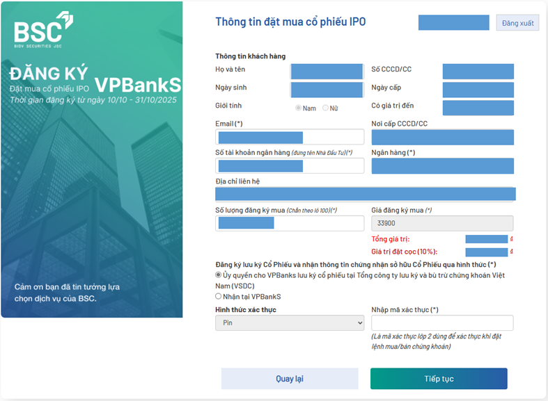 - Điền thông tin đặt mua cổ phiếu IPO VPBankS: Hệ thống sẽ tự điền thông tin của khách hàng theo thông tin lưu trữ tại BSC