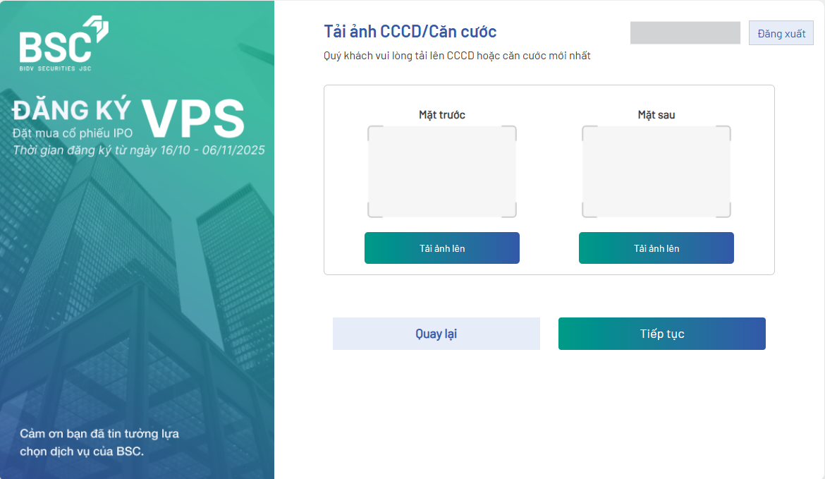 + Tải ảnh CCCD/Căn cước (CCCD/Căn cước trùng khớp với thông tin của khách hàng tại BSC)