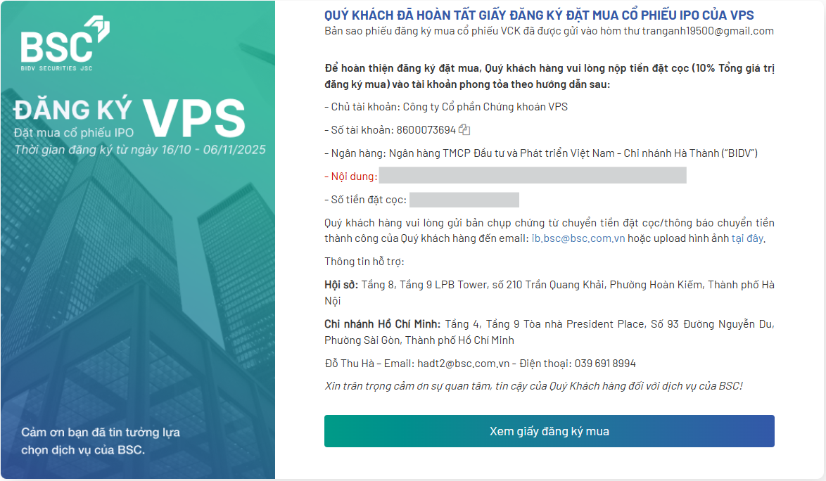 Quý khách đã hoàn tất việc đăng ký đặt mua IPO cổ phiếu của VPS.