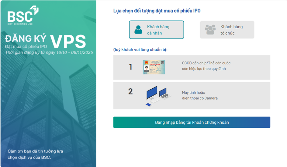 + Lựa chọn đối tượng đặt mua và Thực hiện đăng nhập bằng tài khoản chứng khoán của khách hàng tại BSC