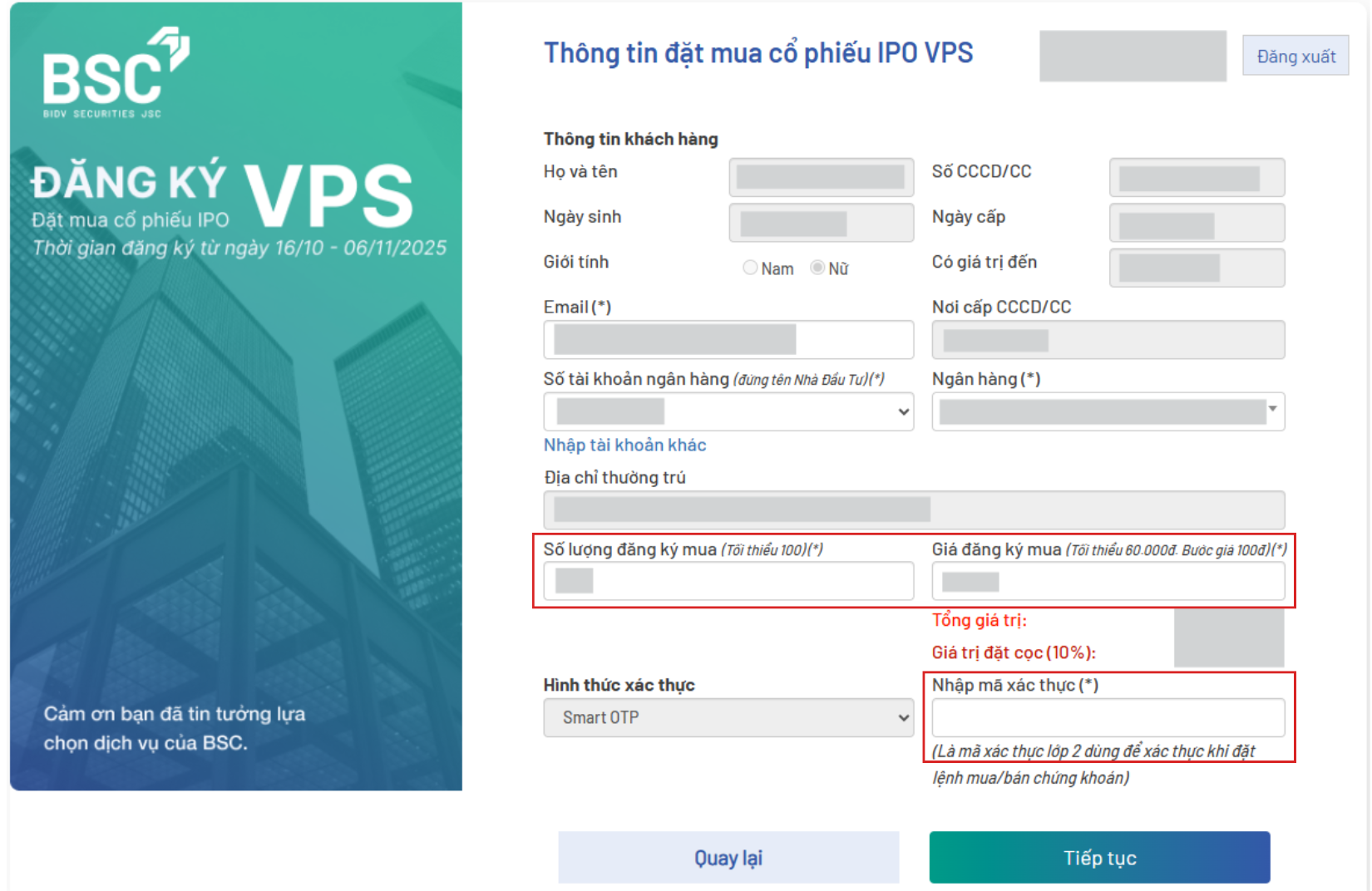 + Điền thông tin đặt mua cổ phiếu IPO VPS: Hệ thống sẽ tự điền thông tin của khách hàng theo thông tin tại BSC