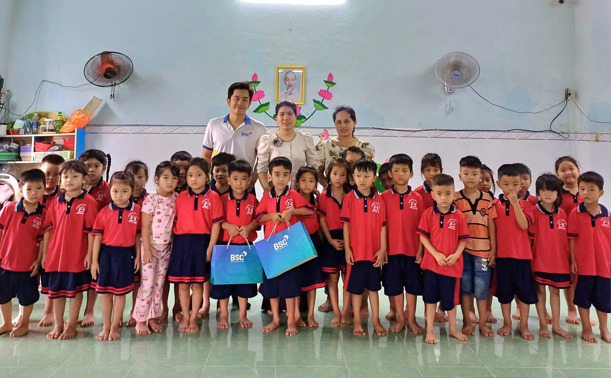Đại diện BSC chụp ảnh cùng các em nhỏ tại trường cùng những món quà nhưng gói ghém tình yêu thương và san sẻ
